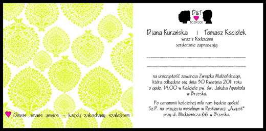 Powstała koncepcja wesela utrzymanego w rustykalnym stylu połączonym z nowoczesnymi elementami ludowymi. Dzięki połączeniu łowickich motywów zinterpretowanych w nowy designerski sposób, graficznego liternictwa, żywej palety kolorów, udało się stworzyć oryginalne i niepowtarzalne zaproszenia i dodatki ślubne. W bogatej palecie kolorów dominuje intensywny róż, fuksja i zieleń.